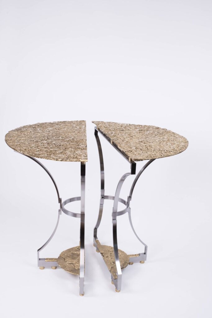 Dariule Création d’objets en métal Console Cressent Issu d’une famille d’antiquaires, Antoine Dariule fait du métal son matériau de prédilection : matière tenace et pérenne,symbole de force, il l’associe à des matériaux nobles – dentelle de bois, pierres fines, porcelaine, marqueterie de paille – pour créer des objets singuliers et développer un langage artistique empreint du goût français et enrichi d’une perspective contemporaine. Son atelier se distingue par la marqueterie de laiton, alliance subtile de tradition et modernité. La collection Cressent illustre cette démarche : tables et consoles demi lune, aux lignes épurées et sculpturales, associant acier brossé et plateau en bronze dont la texture révèle la richesse de la matière. Par sa rigueur géométrique, ses lignes sobres, ses matériaux nobles, elle s’inscrit dans l’esthétique de l’Art déco tout en affirmant une vision contemporaine, incarnant héritage artisanal et innovation, fidèle à l’esprit des arts décoratifs français. Lieu d’exposition : Petit Palais Période de référence : Art déco Contact : Antoine Dariule ✦ 91 Rue du Faubourg Saint-Honoré 75008 Paris Email : antoine@dariule.fr Site web : www.dariule.fr Instagram : @antoine.dariule Crédit photo : ©Dariule
