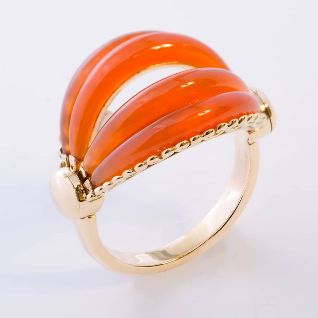 La bague « Coloquinte » se distingue par ses quatre croissants de cornaline, délicatement mobiles grâce à un mécanisme dissimulé, offrant un jeu subtil de mouvement et de lumière. La bague « Collerette » évoque quant à elle une douceur rosée, sculptée en une multitude de replis et sublimée par de généreux godrons d’opale rose taillés sur œuvre.