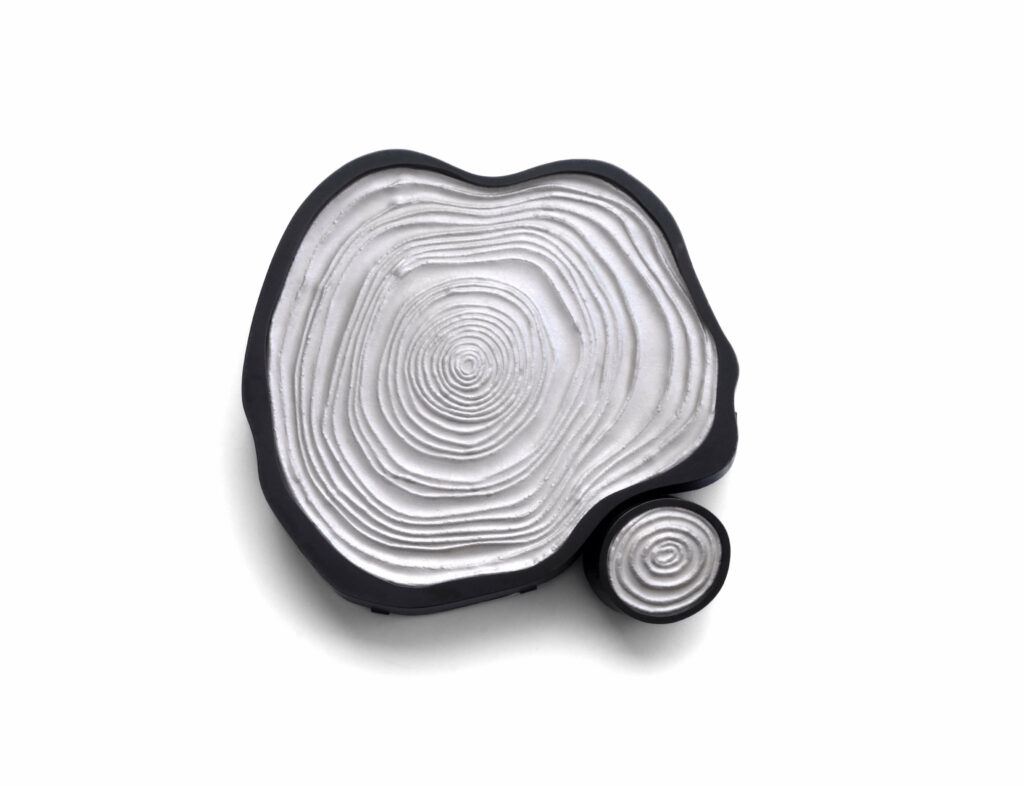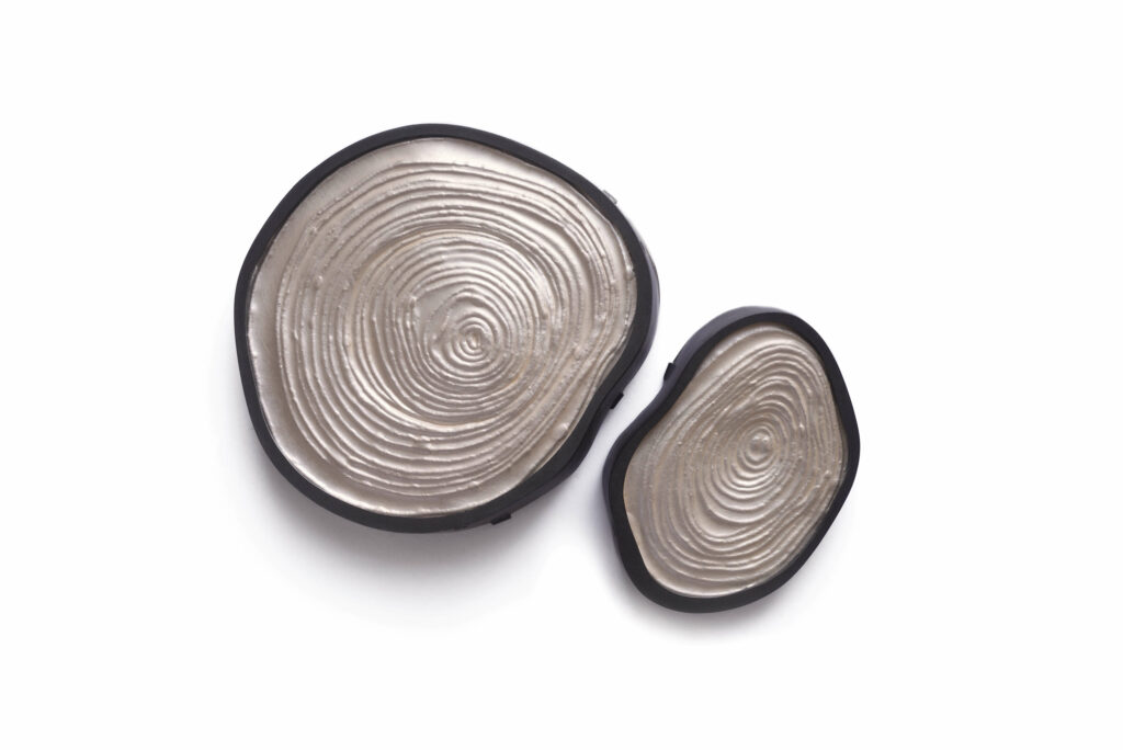 Gabriele Hinze est née à Essen en 1964 et a terminé son apprentissage d’orfèvre en 1983. La plupart des bijoux qu’elle a créés traitent du thème de la préservation : elle s’inspire de ce qu’elle voit et grave des images dans de fines feuilles d’argent. Ses broches exposées ici s’inspirent du cambium, la fine couche d’un arbre située entre l’écorce et le bois. La technique utilisée dans Kambium, le ciselage, est employée dans la joaillerie depuis l’Antiquité et a très peu évolué au fil des siècles : le métal est placé sur une surface souple, puis des motifs y sont pressés ou enfoncés à l’aide d’un marteau et d’un poinçon. Selon Gabriele Hinze, utiliser cette technique pour des pièces contemporaines est à la fois difficile et gratifiant.