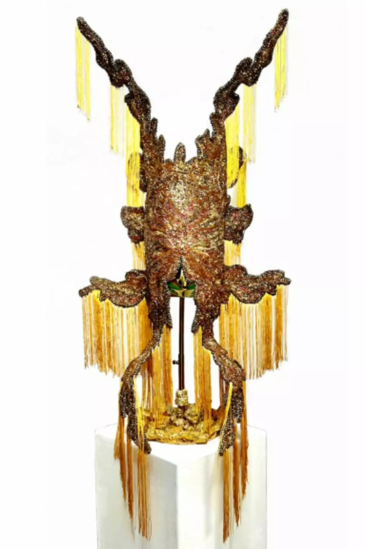 Interstellar est un masque sculptural suspendu entre le rituel terrestre et le mystère céleste, reliant le visible et l’invisible. Sa surface dorée scintille de reflets changeants, évoquant galaxies lointaines et mouvements agités des étoiles. Des franges dorées se déploient comme des éruptions solaires, tandis que des touches de rouge vibrent comme des braises cosmiques.