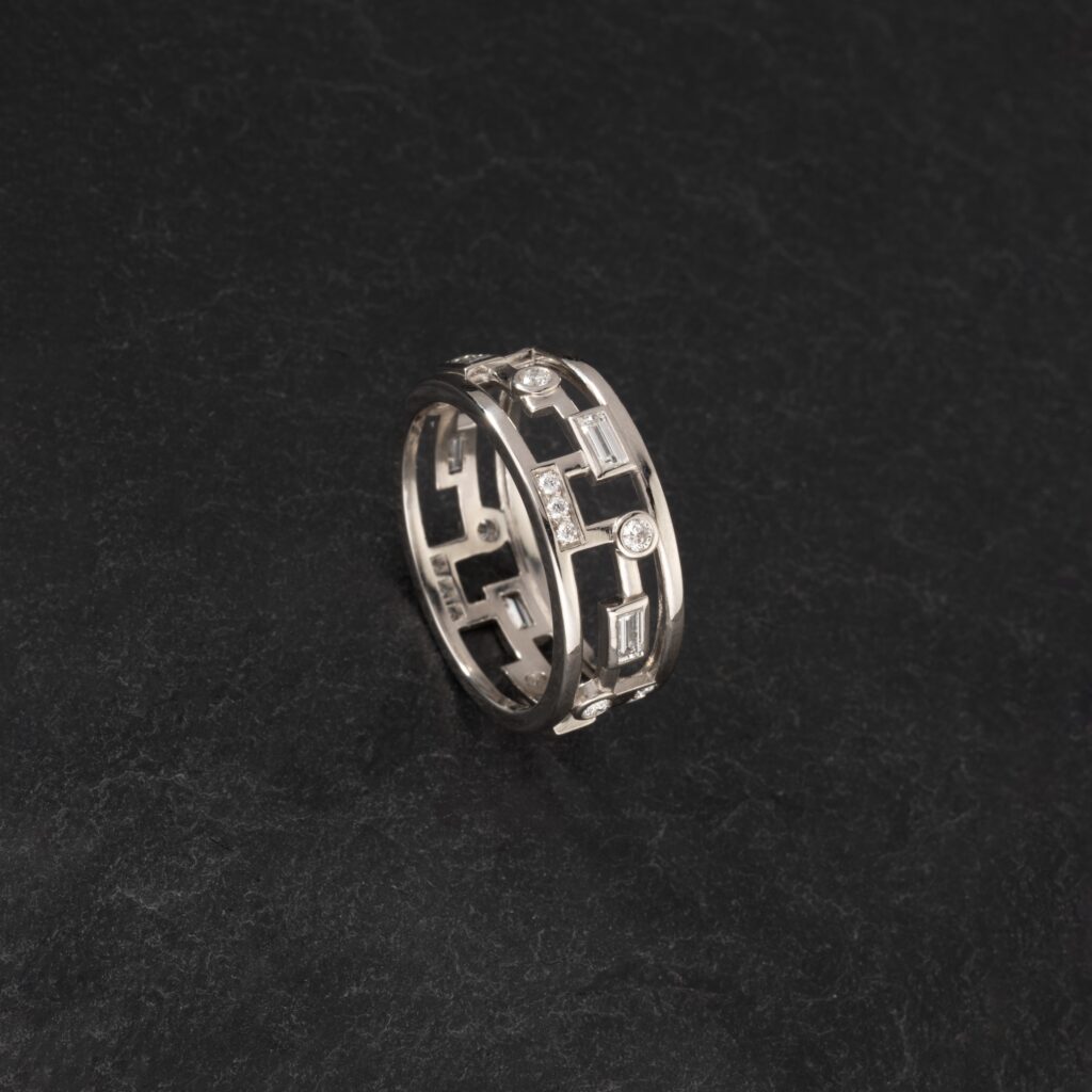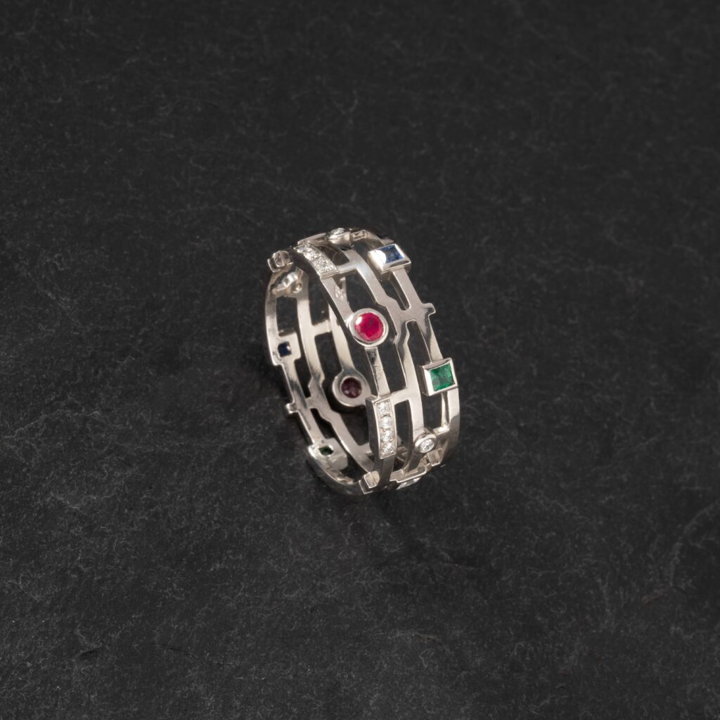Joaillier créatif et Maître artisan d’Art, Marc Alexandre conjugue plus de 30 ans de savoir-faire avec une imagination singulière. Avec la ligne « Ôm », il établit un pont entre passé et présent, reprenant les codes géométriques de l’Art déco tout en leur insufflant une vision contemporaine, sans se limiter à une simple reproduction. Fidèles à l’époque, les anneaux sont en platine et ornés des quatre pierres précieuses classiques : diamants, rubis, saphirs et émeraudes. L’originalité moderniste de cette ligne réside dans l’usage de la géométrie comme principe de construction : les pierres révèlent les formes visibles (rondes, carrées, rectangulaires) tandis que les anneaux et leurs séquences s’articulent selon la divine géométrie, notamment la division naturelle du cercle.