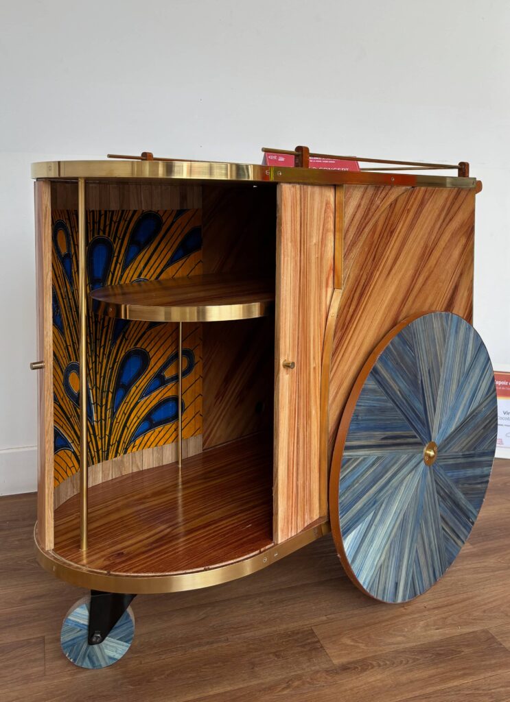 Plumassière contemporaine, Béatrice crée au sein de son atelier Plumavera des œuvres où la plume devient souffle, texture et lumière. Avec Volute, elle explore l’élan courbe cher à l’Art nouveau : deux tiges de laiton émergent d’un socle de chêne, semblables à des silhouettes fluides. Leur mouvement s’étire en une longue traîne de plumes de paon, frisée et assemblée une à une, dessinant un courant d’eau vibrant. Chaque plume, préparée selon les gestes traditionnels, révèle son éclat intime et sa vibration naturelle. Cette harmonie de lignes et de textures invite le regard à suivre la naissance d’un geste, comme si le vivant se déposait au cœur de la forme.